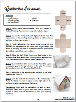 This fantastic no-prep resource guides students through researching, designing and constructing Santa's Workshop. Students are guided through the process of floor plan design, configuring the location/size of each piece of equipment and furniture, determining the area of each piece of equipment, and calculating the construction costs while staying on budget. Students then design and colour both the interior and exterior of their homes before they begin construction (instructions with photos included).