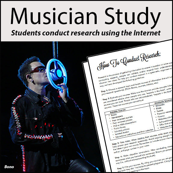 Throughout modern history, musicians have entertained and inspired millions of listeners around the world. From John Lennon’s serene melodies to Michael Jackson’s pulsing funk, musicians and their music can vary widely from one another. For this assignment, students choose a famous musician to study and create a project to showcase their learning.