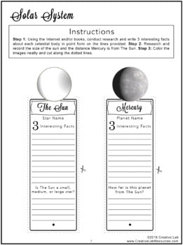 Using the Internet and/or books, the students research the planets of the Solar System (Mercury, Venus, Earth, Mars, Jupiter, Saturn, Uranus, Neptune, The Moon, The Sun) and write 3 interesting facts for each. At the bottom of each page, students research and answer supplemental questions for each topic. On the back page, students are asked to reflect on the most interesting planet they studied and how the Solar System formed.