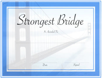 This resource is designed as a Contest (but doesn't have to be done as such) where students are challenged to build the strongest bridge possible. Certificates for Strongest Bridge and Most Innovative Design are included along with a 4 page Student Write-up Booklet.