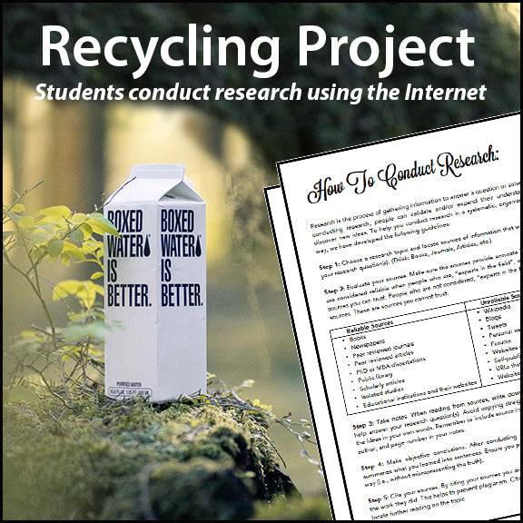 This resource guides students through conducting their own research report on a recyclable material (75+ topics are listed). After choosing a topic to focus on, students are asked to conduct research using the Internet and books while following criteria. Next, students are asked to share their learning by creating a poster board, presentation board, power point presentation, or dodecahedron (Instructions and Pentagon Template included). Artwork may also be created to further display learning. Finally, students present their work to the class.