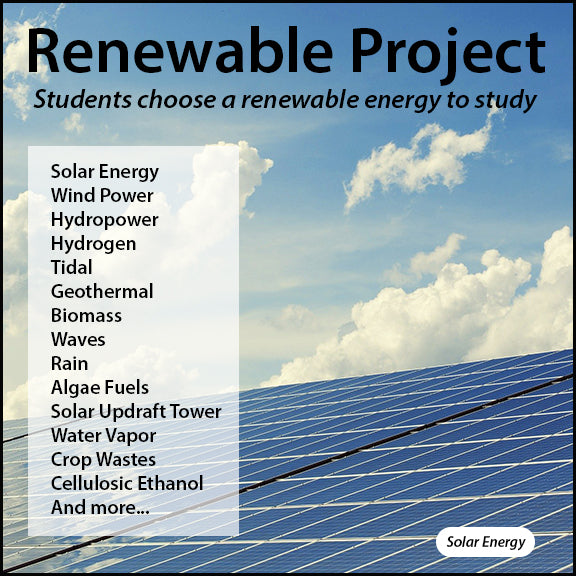 For thousands of years, people from around the world have been creating innovative ways to collect useful energy from renewable resources. For example, in 200 BC, waterwheels were invented to convert the energy from moving water into mechanical or electrical energy. From solar energy to algae fuels, people today are continuing this tradition to create more sustainable energy options. For this assignment, students will choose a renewable energy source to study and create a project to showcase their learning. Have fun!