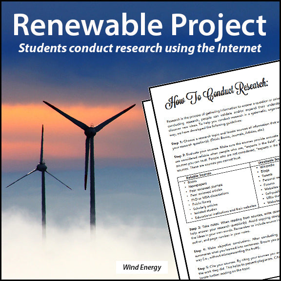 This resource guides students through conducting their own research report on a renewable energy source (17 topics are listed). After choosing a topic to focus on, students are asked to conduct research using the Internet and books while following criteria. Next, students are asked to share their learning by creating a poster board, presentation board, power point presentation, or dodecahedron (Instructions and Pentagon Template included). Artwork may also be created to further display learning. Finally, students present their work to the class.