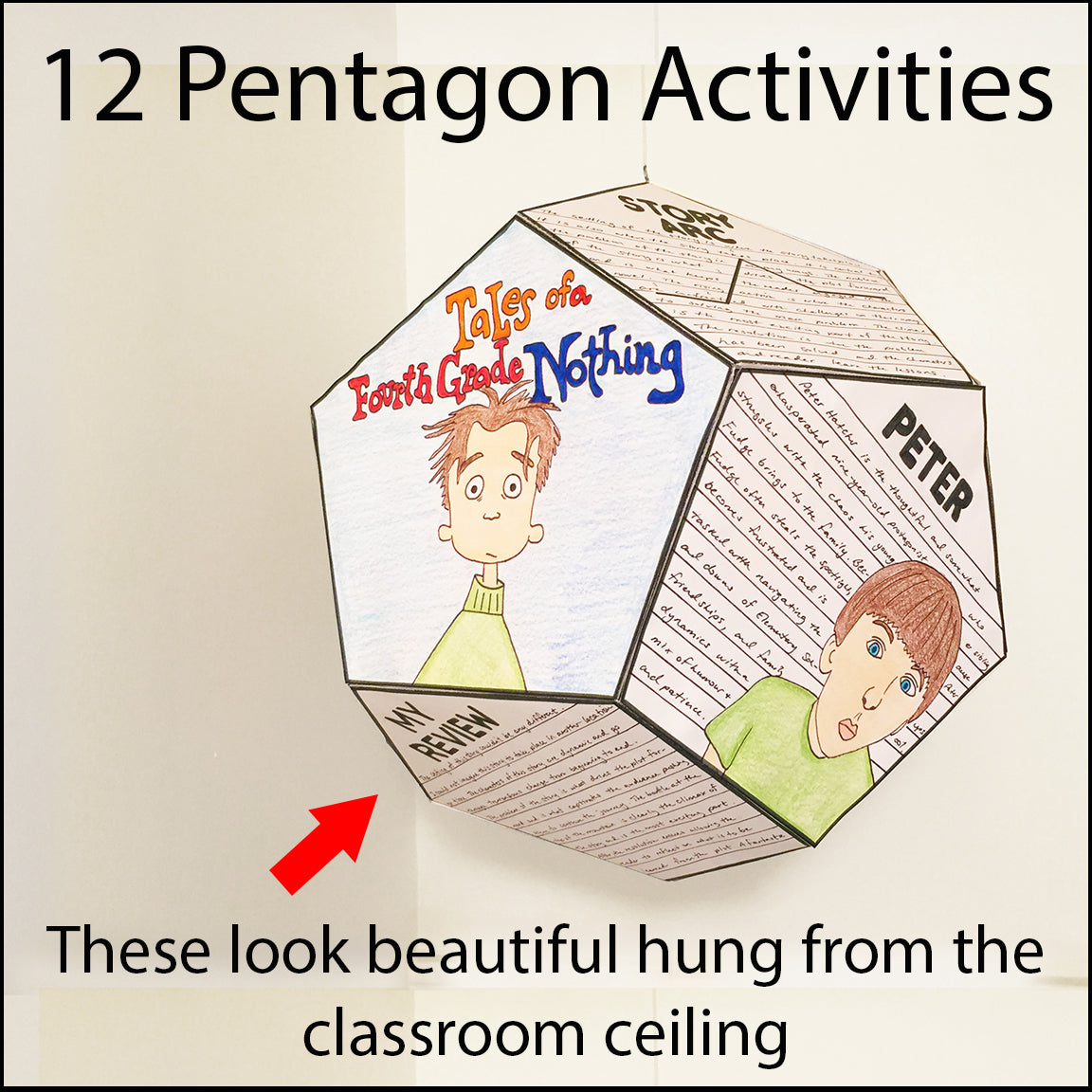For this project, students will complete 12 activities related to Tales of a Fourth Grade Nothing and construct a 12-sided polyhedron called a dodecahedron to showcase their learning. These can be hung from the ceiling and are beautiful on display.